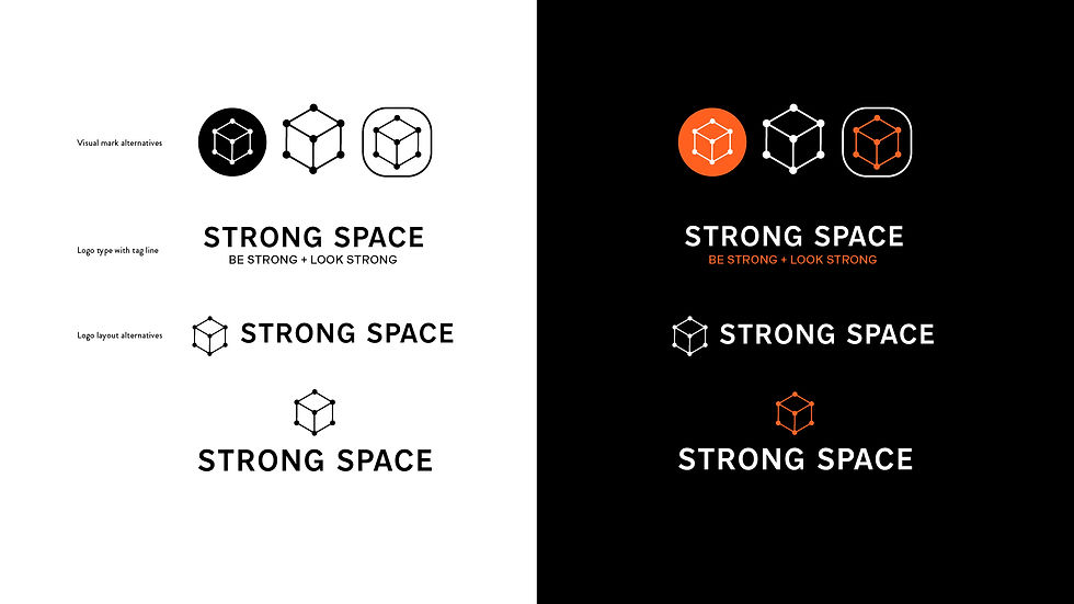 a bold colour palette consisting of black, orange and white. The austere quality of this colour combination reflects the dedicated attitude of the Strong Space brand. For print and digital application, the brand identity adopts a spacious approach towards layout. In tandem with the use of a bold colour palette and